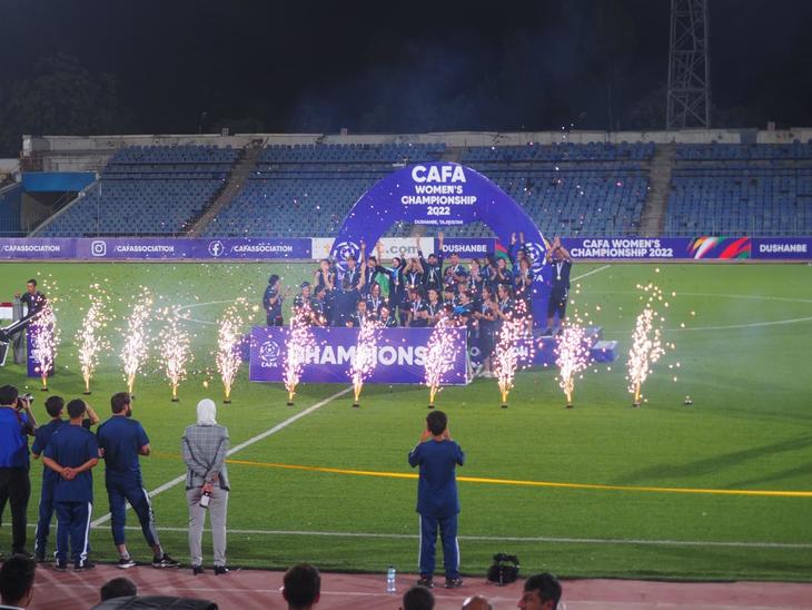 そして本番のCAFA女子選手権。私はスタッフとしての帯同はできませんでしたが、せめて直接彼女たちを応援しなければ…と、弾丸日程で現地に向かい優勝決定戦のイラン戦を観戦。圧倒的に試合を支配するのになかなか点を決めきれない中、終了5分前に唯一のゴールが決まるという劇的展開で1-0で勝利し、見事優勝を果たしたのでした! ゴールの瞬間は選手・スタッフほぼ全員がベンチから飛び出して喜びを爆発させ、チームの結束の強さを感じさせてくれました。