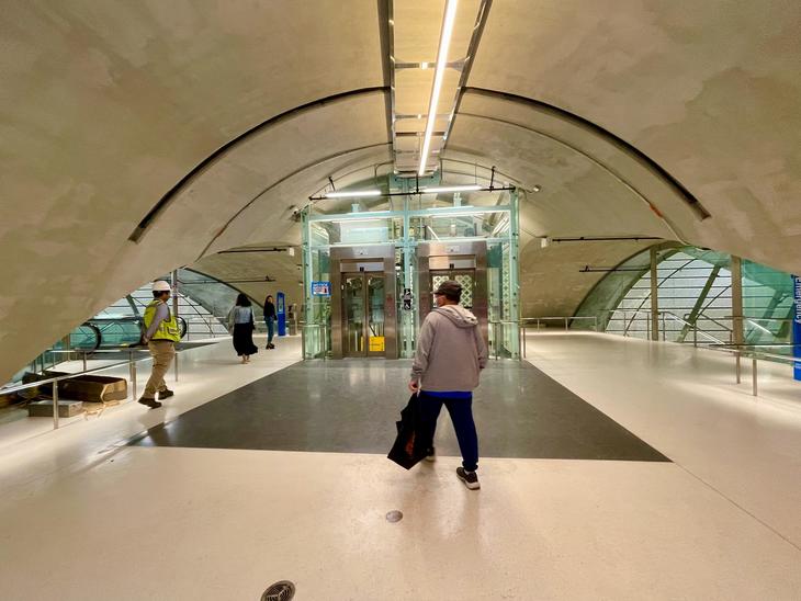 ▲まだまだ辿りつかない→後方のガラスのエレベーターはプラットホームへ