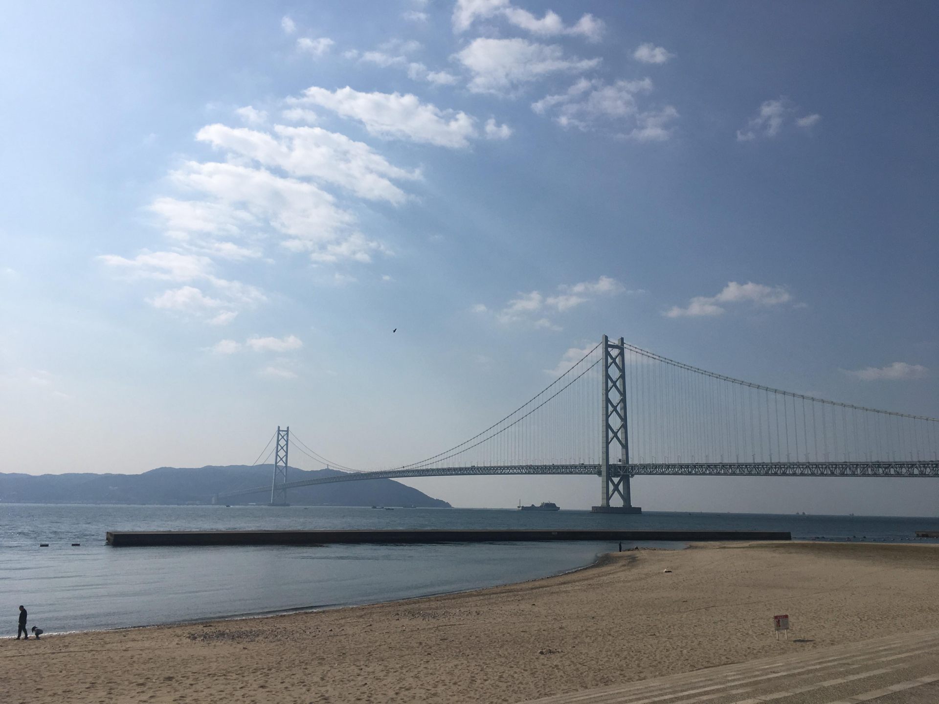 2022年にトルコのダーダネルス海峡のつり橋に抜かれるまで、世界最長のつり橋だった明石海峡大橋のたもとにあるアジュール舞子。海岸からは至近距離で明石海峡大橋や対岸の淡路島、明石海峡を行き来する漁船やフェリーが見え、遊泳はもちろん砂浜から景色を見るだけでも十分に楽しめます。