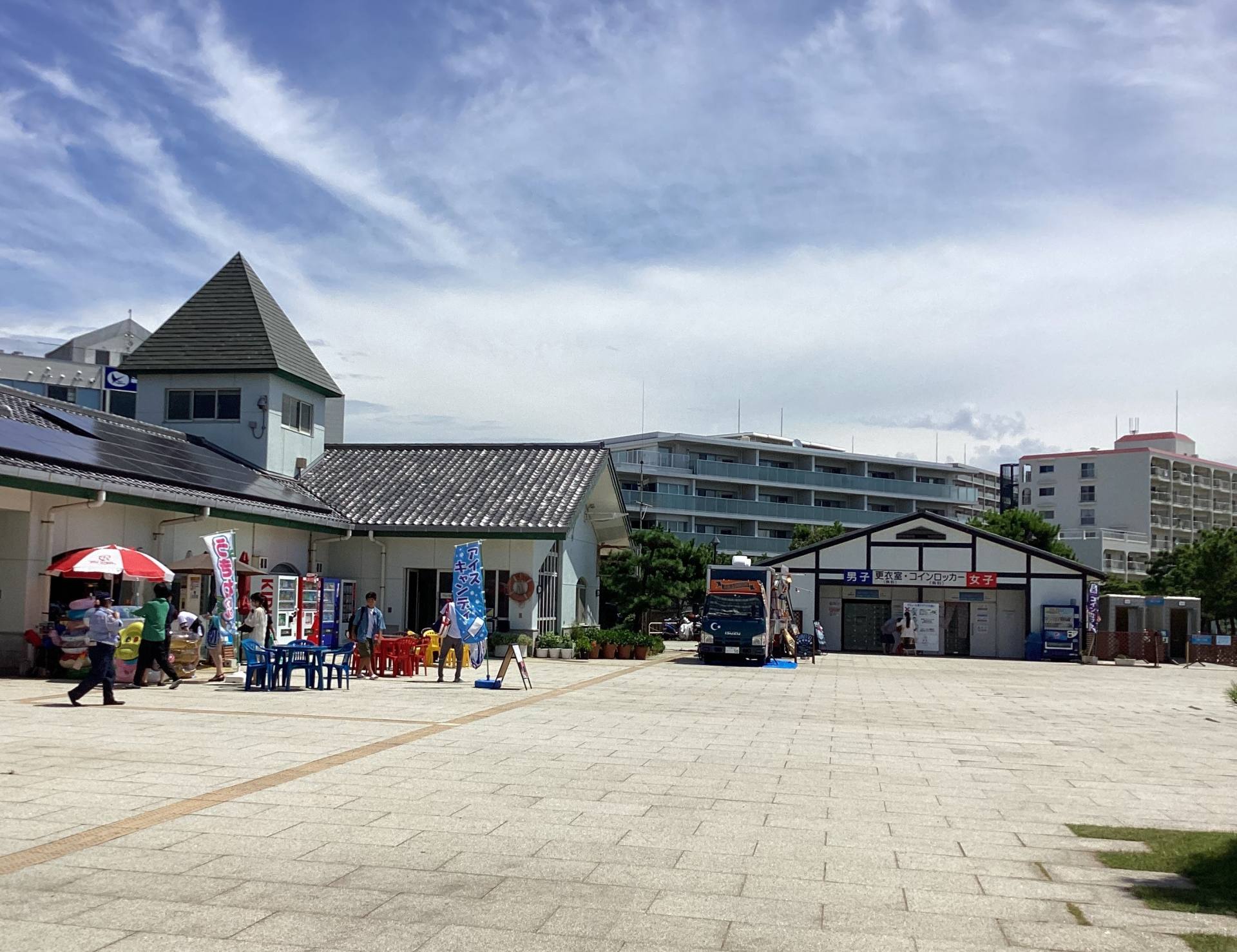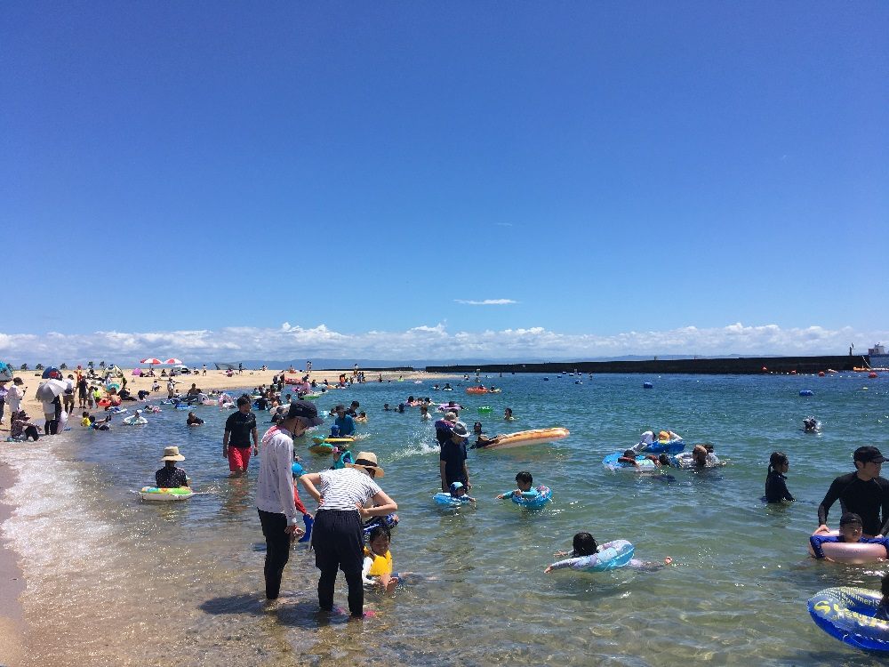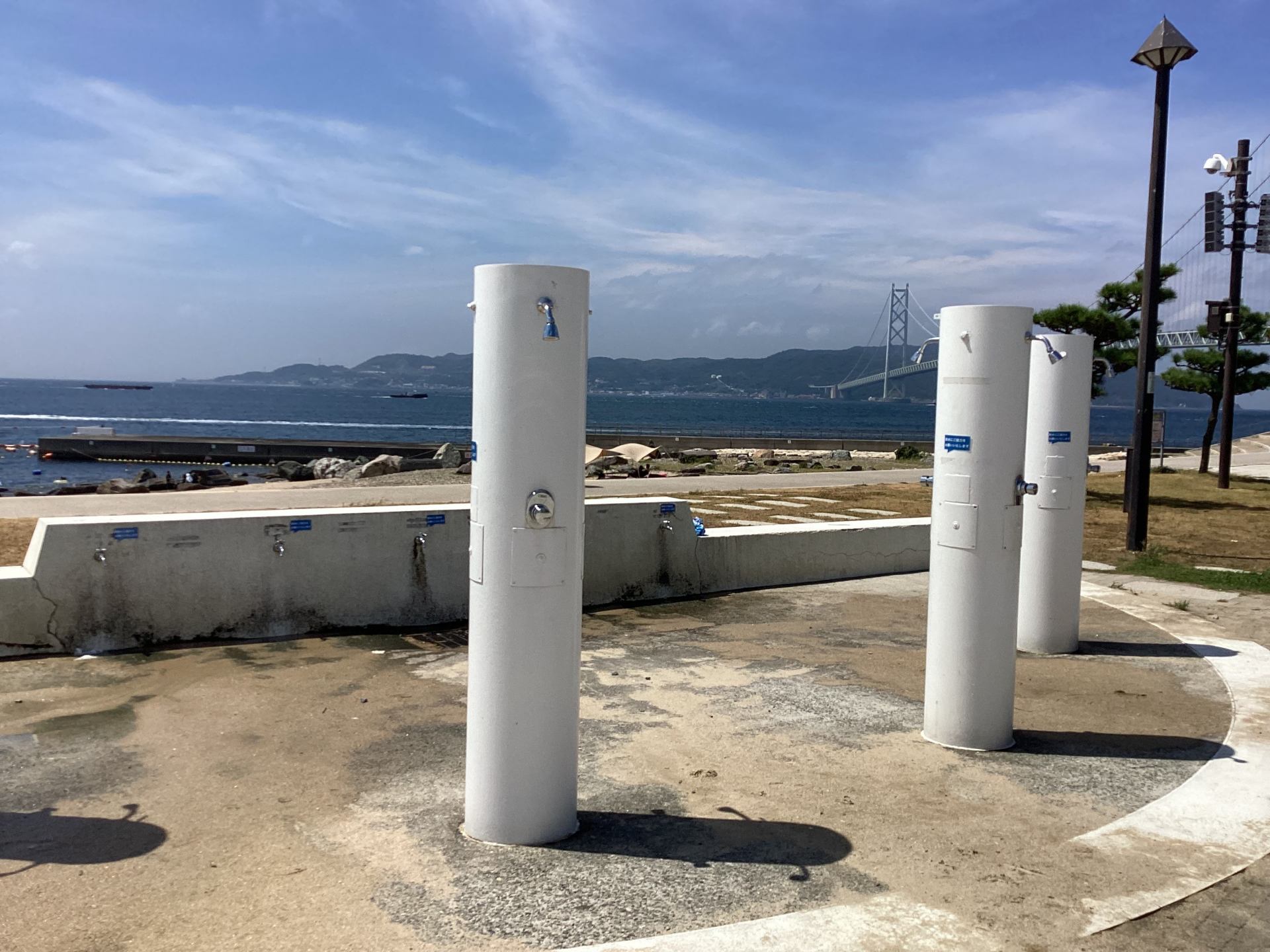 神戸市内には、「須磨海水浴場」という関西では有名な海水浴場があります。アジュール舞子は須磨海水浴場があるJR須磨駅からわずか3駅(快速電車の場合は2駅)しか離れていないにも関わらず、須磨海水浴場に比べると地元客が多く落ち着いた印象です。海の家の出店はありませんが、トイレ、シャワー、更衣室、コインロッカーがあるのでとっても便利! 無料で浮き輪の空気入れを利用できるので、浮き輪を事前に膨らませたり空気入れを持ってくる必要もありません。