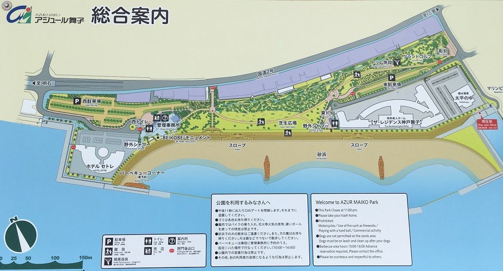 アジュール舞子の名前の由来はフランス語のazur(青色)。フランスのコートダジュールのような美しい砂浜でみんなが憩える場所になるようにと一般応募で名づけられた名前です。最寄りの山陽電車 霞ヶ丘駅からは徒歩で約5分、JR舞子駅や隣接する山陽電車 舞子公園駅からでも徒歩で7分程です。