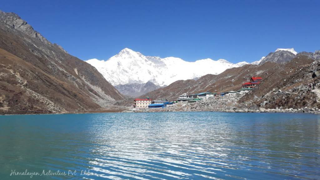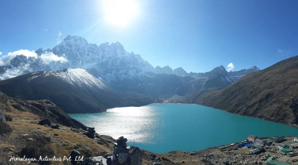 一方こちらは、10月31日、エベレスト方面ゴーキョ(4750m)とゴーキョピーク(5360m)から見えた景色です。雲一つない快晴の下、エメラルドグリーンの湖が輝いています。