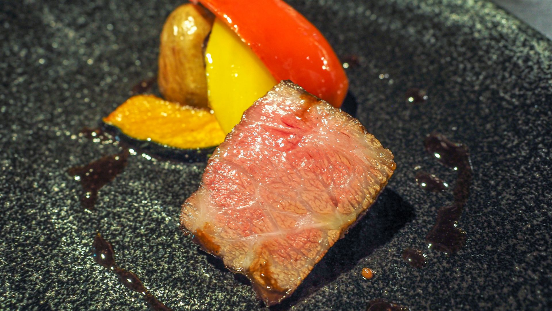 赤と黒の色使いが印象的なこのお料理は、MMGが最もおすすめする「志方牛」をメインにしたひと口サイズのお料理です。