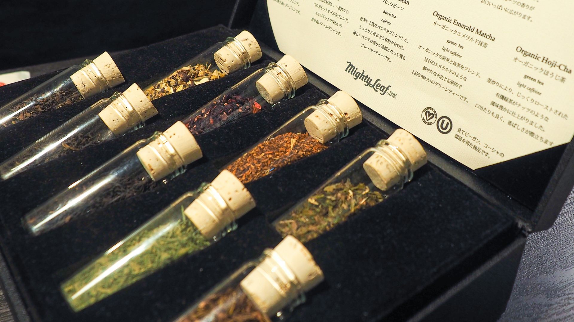 「オーガニックほうじ茶」を含め、「カモミールシトラス」「ワイルドベリーハイビスカス」など、おなじみのフレーバーティーや「オーガニックアフリカンネクター」「オーガニックエメラルド抹茶」など、全9種類のフレーバーティーから選べるのですが、それぞれのティーのテスターがあり(写真)、ボトルのコルクを開け、それぞれの香りを確認してからオーダーすることができます!