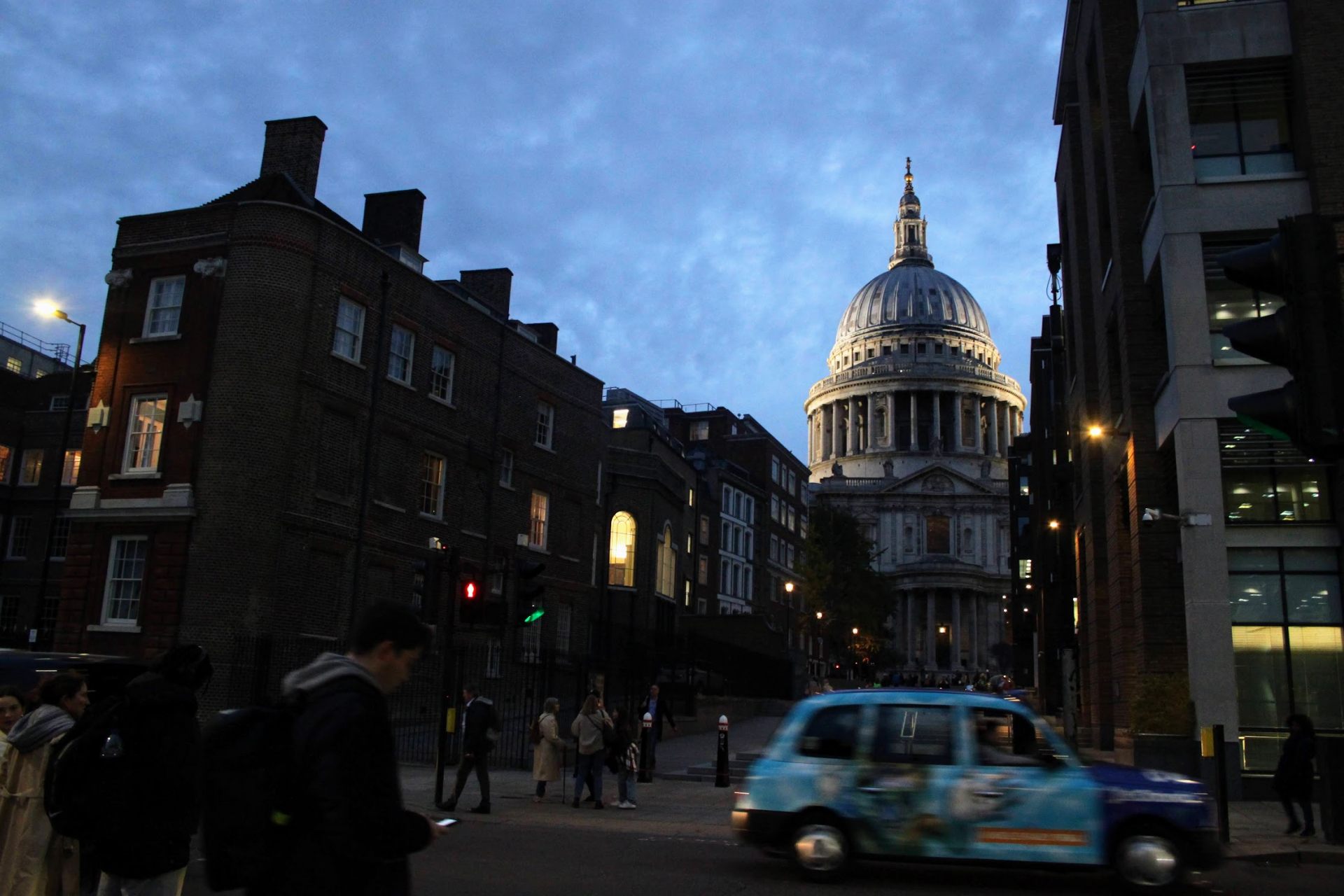 閉店の時間になり外へ出て少し歩くと、夕闇に浮かぶセントポールの姿を見ることができます。