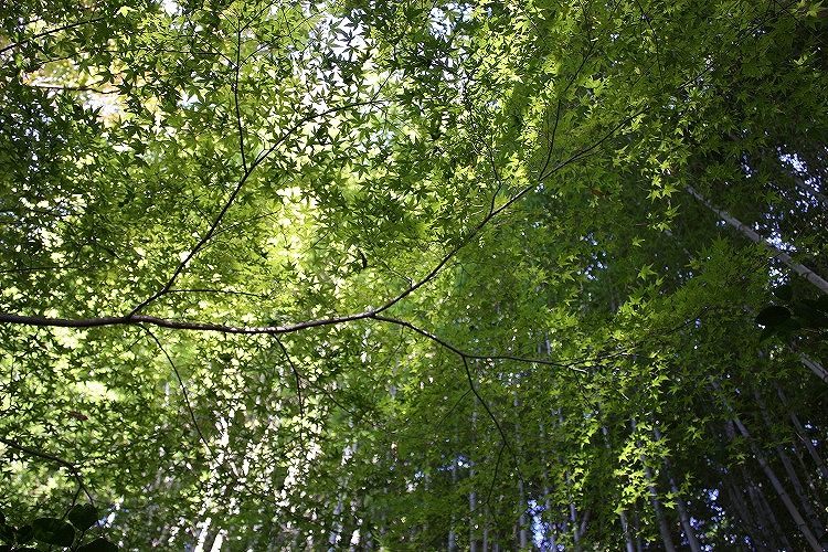 見上げると、もみじと竹林が空を覆うように広がっています。