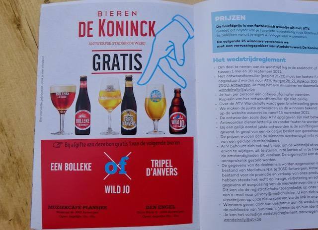 歩き進めていくペースは、個人によりますが、おそらく一律にみんな喉が乾きますよね? そんなときにうれしいGratis(プレゼント)があります。【WANDELRALLY 2021】の小冊子を購入すると、もれなく、アントワープを代表するブルワリー、DE KONINCKのビールが1杯呑めます。お店は2ヵ所から選べます。