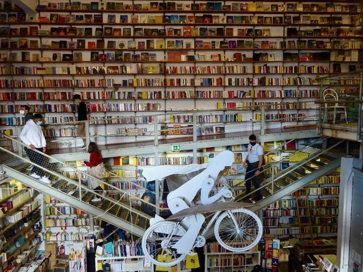 象徴的なデザインの書店”Ler Devagar”はぜひ訪れて欲しい。「世界の美しい書店ベスト20」にも選ばれた書店は実に個性的。圧巻の本棚は3階まで突き抜けています。2階にはポルトガル音楽のC D視聴コーナー、3階部分には古い印刷機なども置かれていて、ちょっとした博物館のようです。