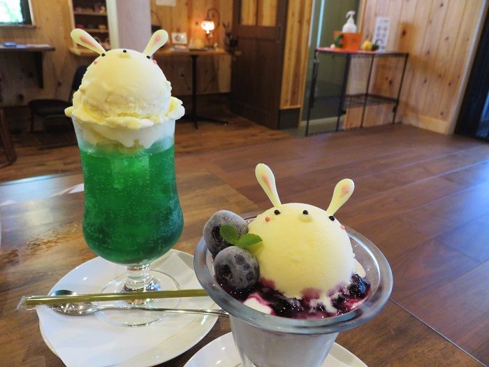 メロンソーダー(うさぎアイスのせ) 715円、うさぎやパフェ 990円