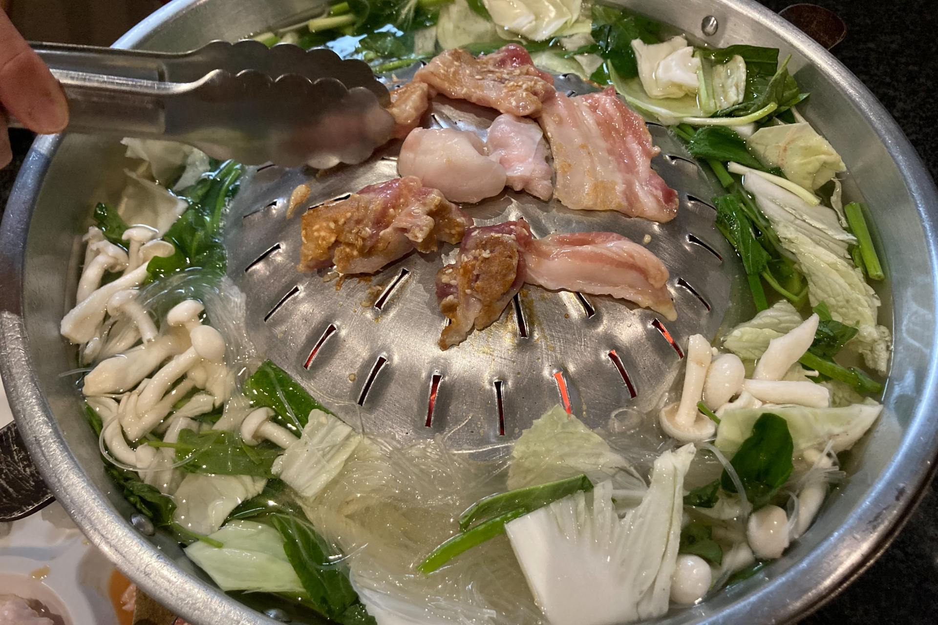鉄板の周りで野菜やキノコの鍋を楽しめ、真ん中で薄切りの豚肉や鶏肉を焼くことができます。
