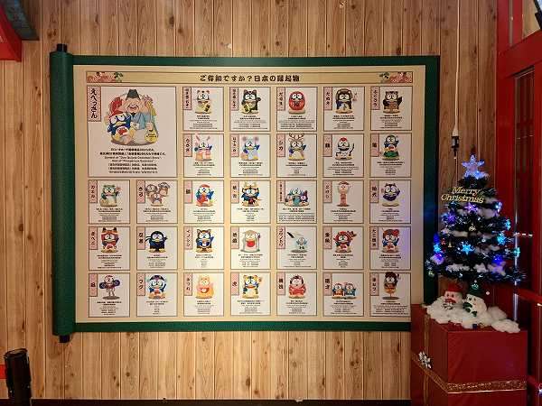 壁にはえびすタワーにまつわる事が貼られています。こちらは、32の日本の縁起物です。まさにゴンドラの数が32基、ゴンドラ全てに異なる縁起物の絵が書かれています。何が来るか楽しみですね!