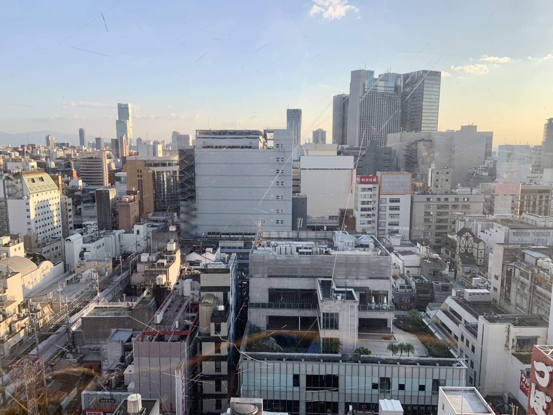 座席の背中側は大阪の北の風景が広がります。ビジネス街の高層ビルが林立していますね。
