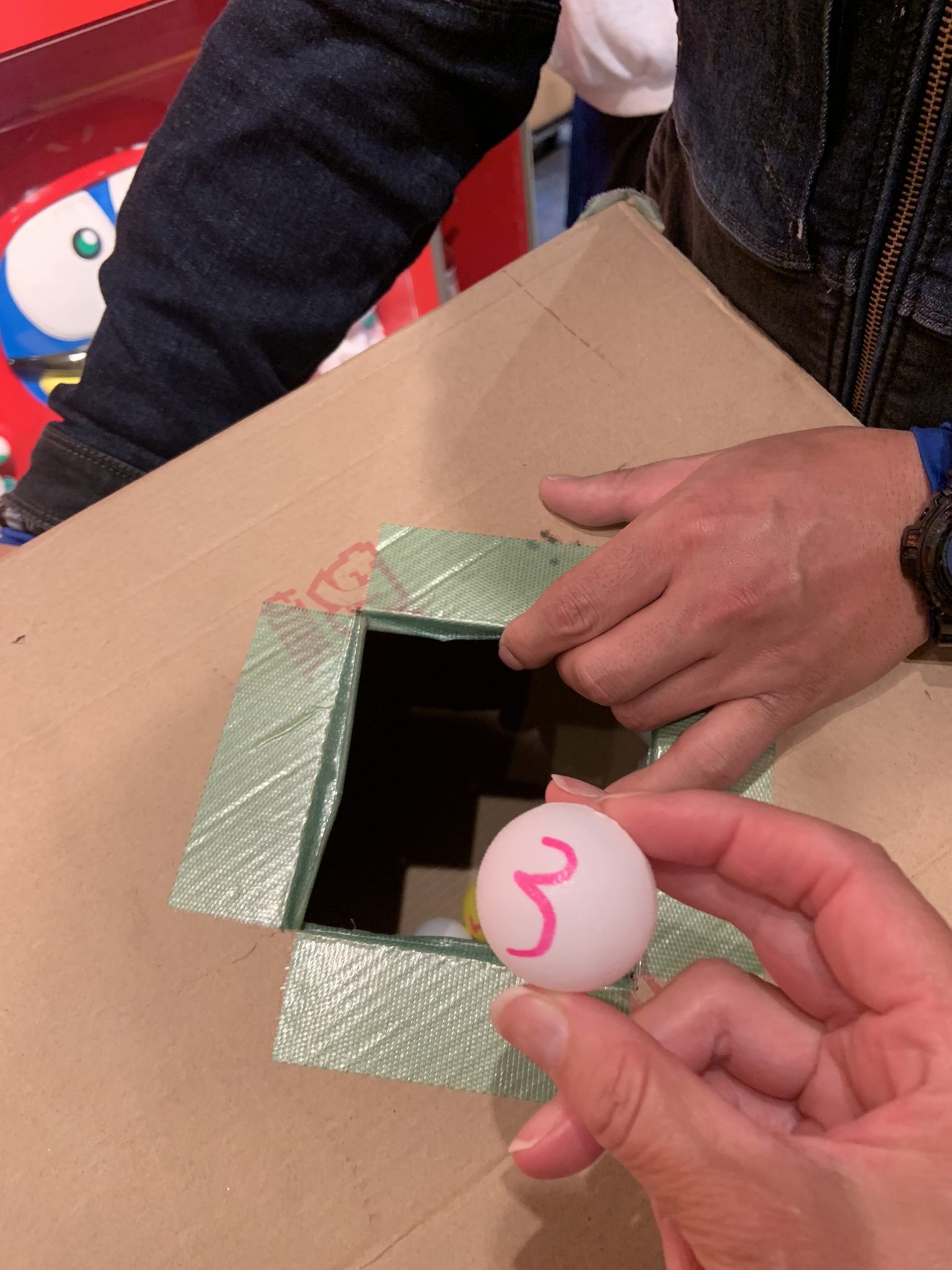 スタッフさんに券を渡すと抽選箱を持って来てくれ、番号が書かれたピンポン玉くじを引きます。
