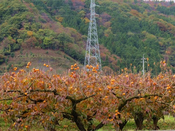 柿の実がオレンジ色に染まり山間の紅葉とともに秋を感じる田舎のほっこりな風景を楽しむことができます。ちなみに花御所柿は、鳥取県東部の因幡地方のみで栽培されていて、そのほとんどが八頭町(やずちょう)で生産されている珍しい柿なんです。そして、天皇陛下に献上されたことでも有名な知る人ぞ知る柿なんですにぃ。