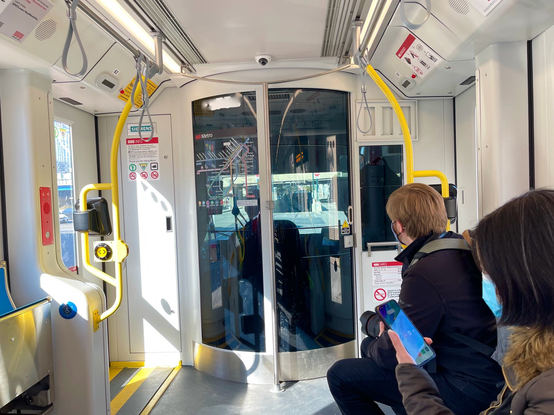 ミュニの最新型車両は、フォースストリートの路面を出発し、ブライアント通りからいよいよ地下に入って地下鉄になります。地下トンネルに入って行く様子は、乗客一同スマホで動画を撮影し始めました。運転席もガラス張りなのでその先の景色もよく見えます。