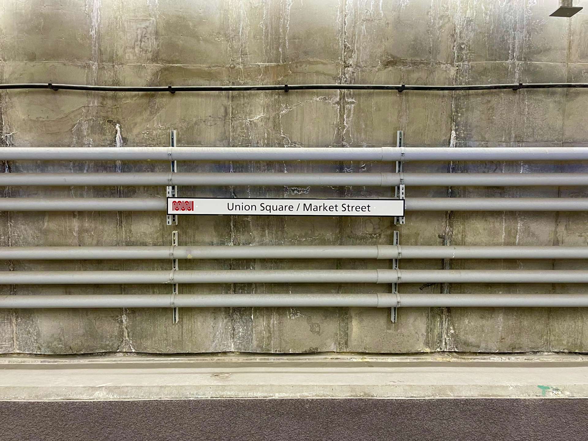次は、ユニオンスクエア/マーケットストリート駅です。おそらく旅行者の方が最も利用する駅になるかと思います。駅名のパネルの壁部分はまだ工事中のようで剥き出しになっていました(微笑)運行に支障はありませんから、まぁよしとしょましょう。日本ならこういうところも綺麗に仕上げて運行開始するかなと思いますが、おおらかなお国柄が出ています。ただ駅名が不思議だなと思いました。と言うのが、ユニオンスクエアはマーケット通りから3ブロックほど北側にあり、この駅名はあまりにこじつけてはいやしないかと感じたのです。