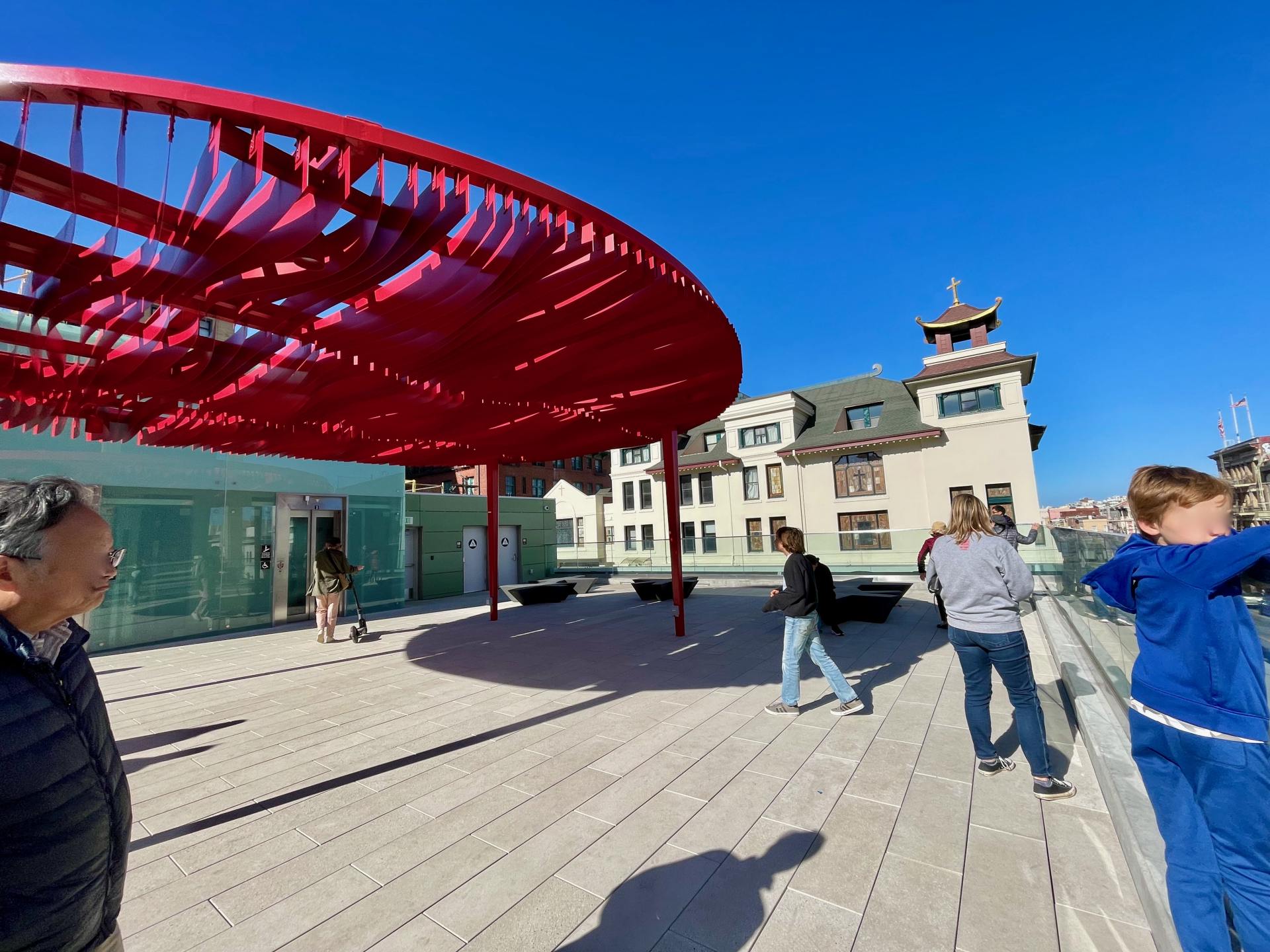 先日の見学会の時も上がれなかった赤い屋根の正体は、「ルーフプラザ」駅舎の屋上です。オフィス街のビルと足元のチャイナタウンの雑多な感じのコントラストがサンフランシスコらしい風景です。
