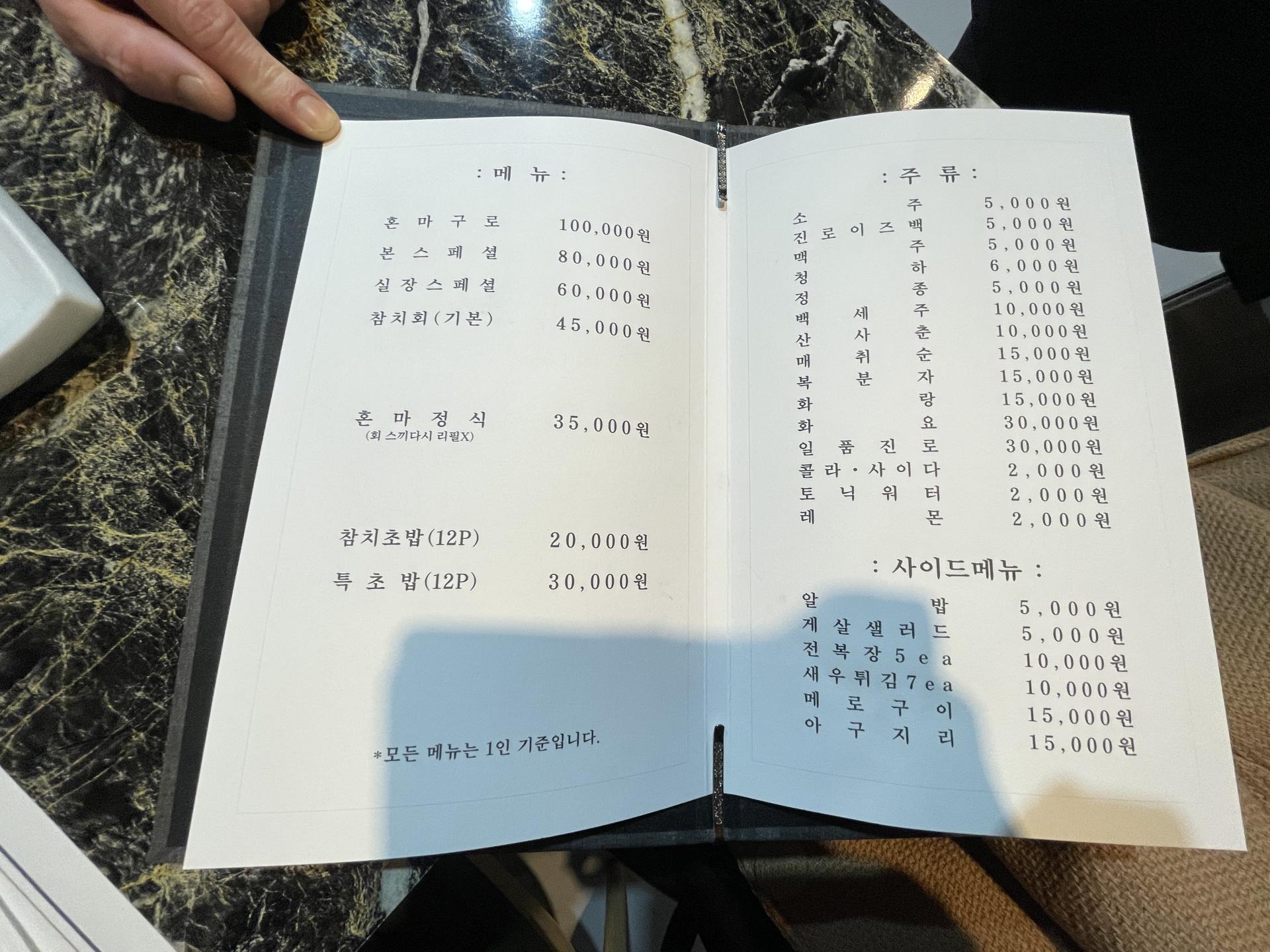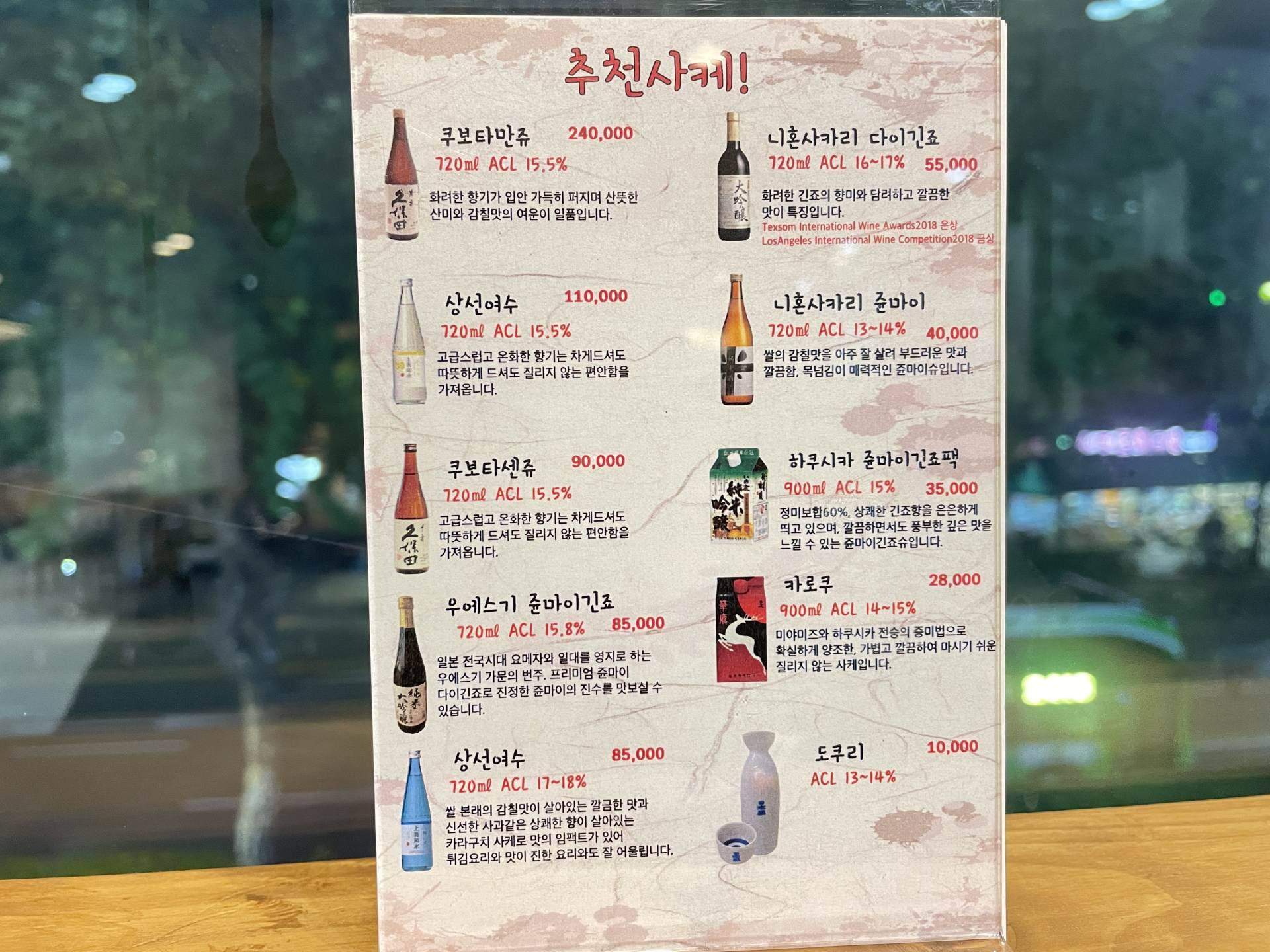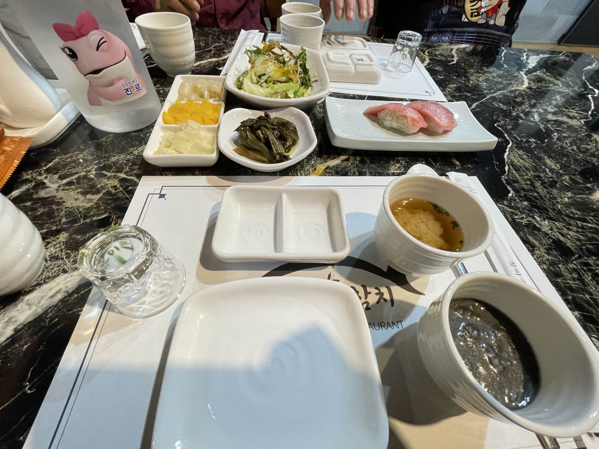 基本のマグロ刺身コース 45,000ウォン(2022年11月のレートで4,700円ほど)からあります。ちょっと高級ですが、突き出しと言われる料理がいくつか提供されます。こちらのお店では2回ぐらいお替わり(韓国ではリピル、리필と言います)できるので、ちょうどいいお値段です。今回は60,000ウォンの室長スペシャルを頼みました。