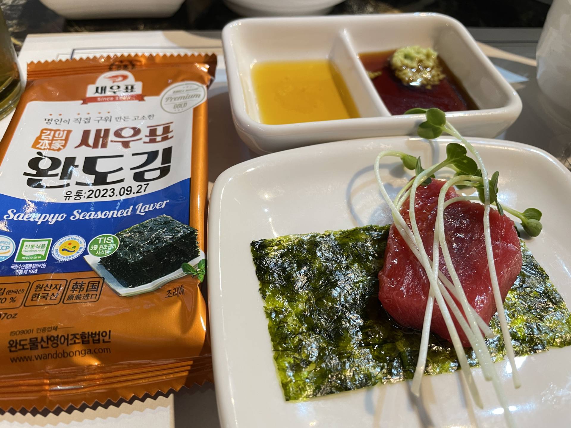 韓国での本マグロの食べ方は韓国海苔に本マグロ、カイワレ大根をのせ、塩とゴマ油か醤油に付けて食べます。ゴマ油につけて食べると、とても濃厚な味がしました。リピルくださいとお願いすると、2皿目が出てきます。