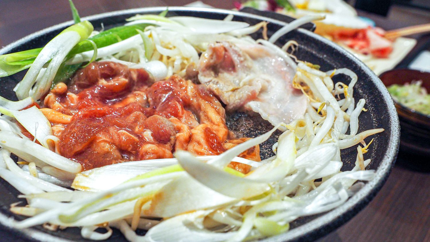 ブッフェのカウンターには、タレ付きジンギスカン用の肉やモヤシ、ネギなどの野菜が陳列され、お好きな具材をお皿に盛り、自分のテーブルで鉄鍋の上で焼いて食べることができます。