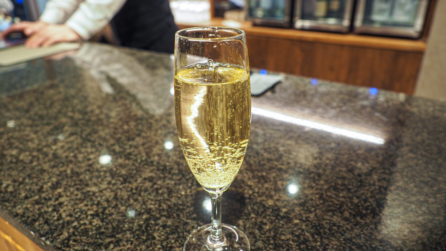写真はグラスで注文したスパークリング(550円/ボトルは1,430円)。