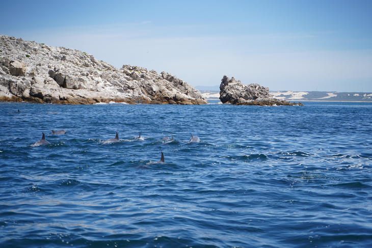 イルカの群れの奥にペンギンの住む島・セントクロア島が見えてきました。