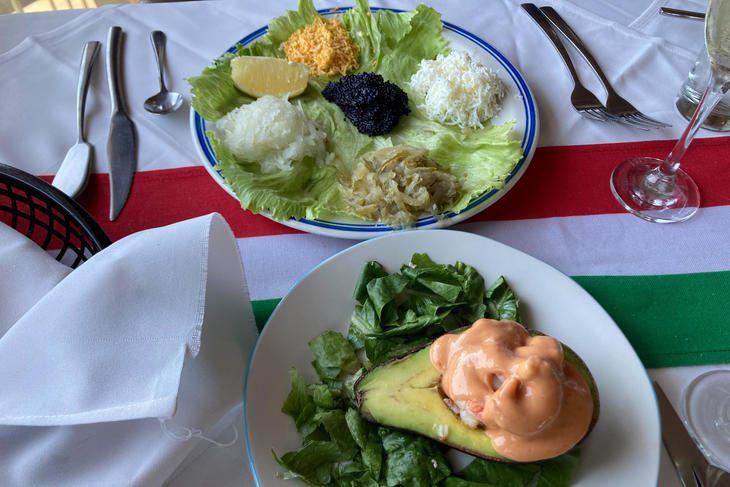 キャビアはレタスにほかの具材とともに挟んで食べる珍しいスタイル。