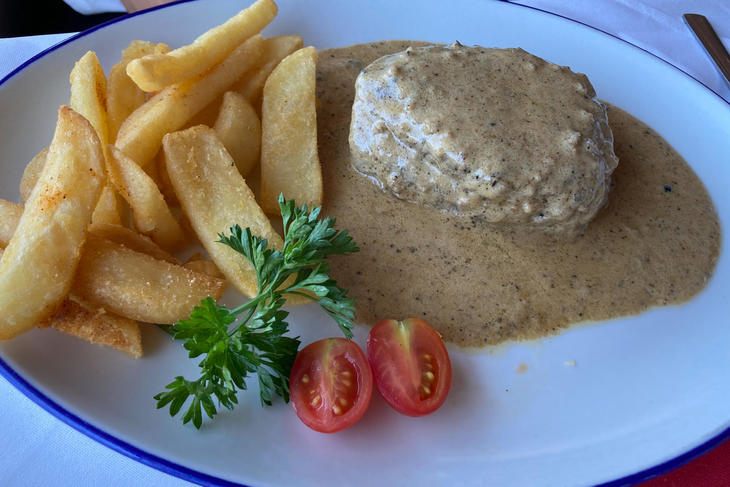 メインはエビのグリルとステーキ。
