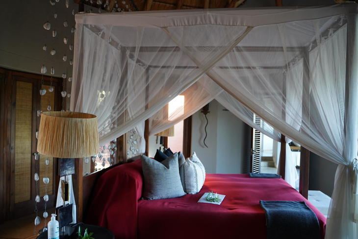 ベッドには天蓋がついていて、バスタブからは大自然が見わたせます。