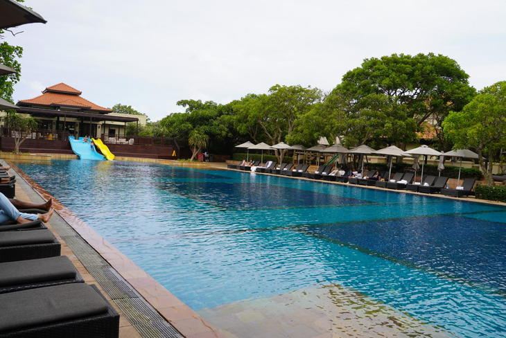 ホテルの名物はウォータースライダーも楽しめる巨大プール。