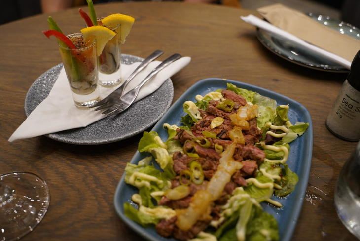 前菜は新鮮なオイスターや牛のタルタル、エビの天ぷらを注文しました。
