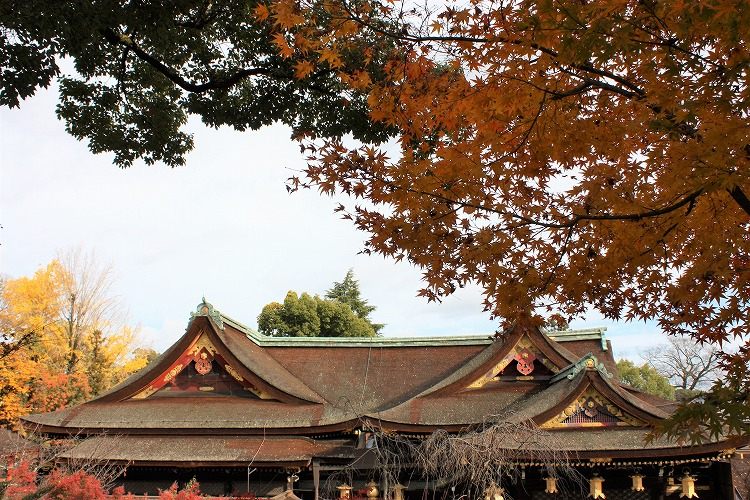 こちらは、摂末社の後方に色付いた銀杏が綺麗に映えています。