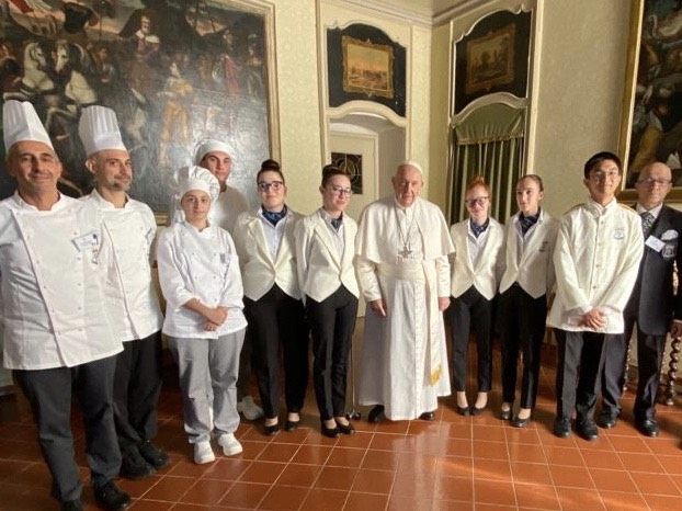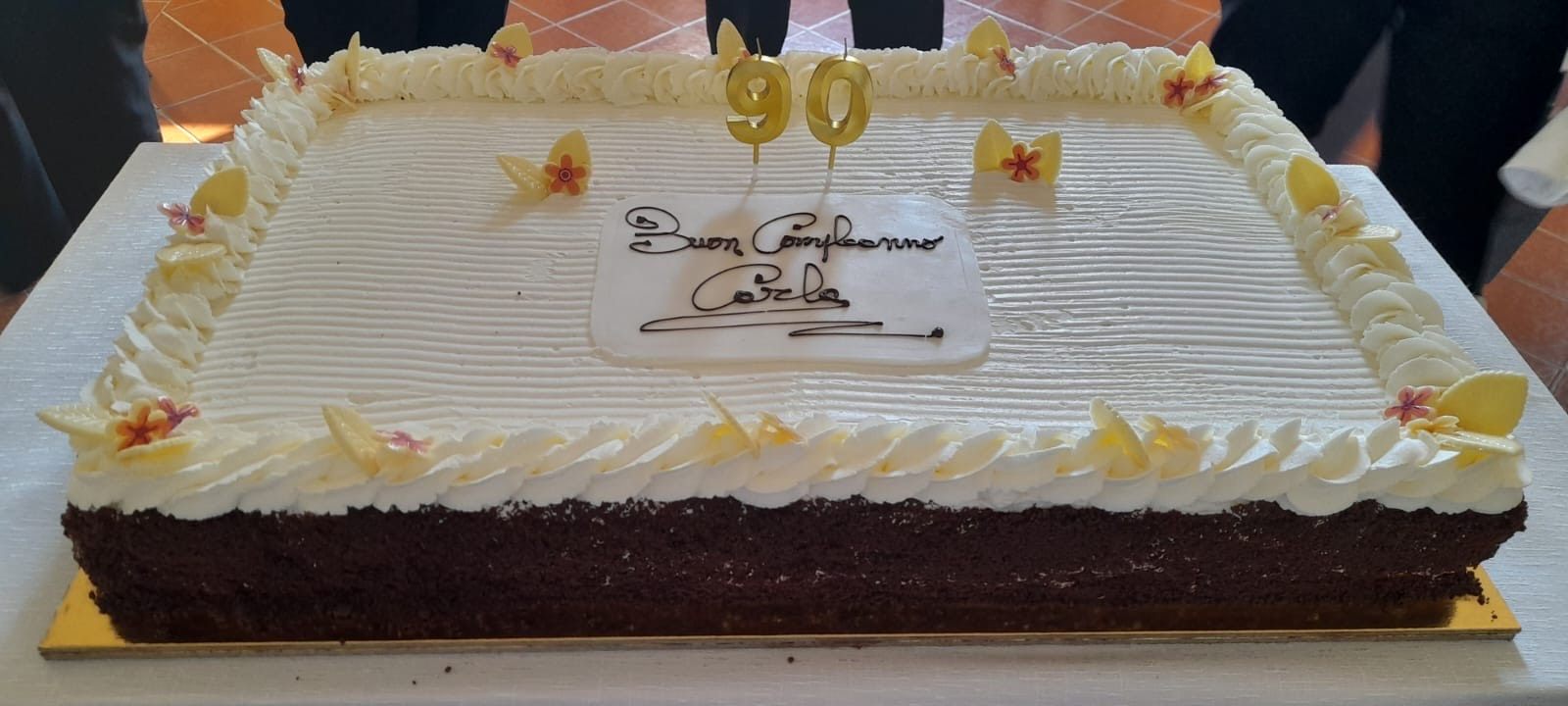 今回のご訪問の理由のひとつに、フランチェスコ教皇の又従姉妹であるカルラさんが、90歳のお誕生日を迎えられたこともありました。日曜日のミサ後の昼食会では、カルラさんへのサプライズお誕生日パーティーが行われました。実は、私が仕事でもプライベートでもよく知るアスティにある料理専門学校の先生と生徒さんがカルラさんのお誕生日ケーキを考案、制作、従事しました。昼食会は、アスティの特産物、土着品種ワインとともに和やかに終了し、名残惜しくもフランチェスコ教皇は、ご公務を終え、ローマへ帰省されました。