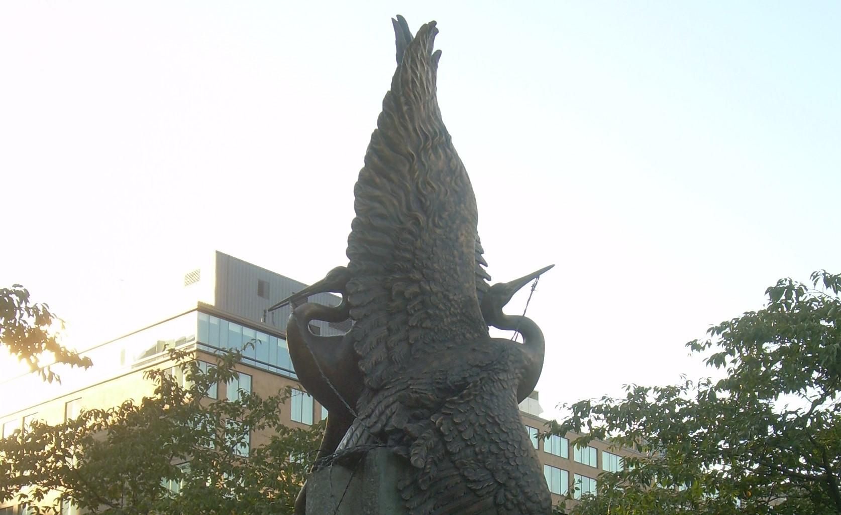 メモリアル内は、枯山水風の人工池(※池に水が流れているときもありますが、取材時に水はありませんでした)が配され、二羽の鶴の彫刻の周囲には強制収容所の名前と収容人数が刻まれた大きな石壁が囲んでいます。二羽の鶴の像は有刺鉄線が羽に絡まっている姿をしています。