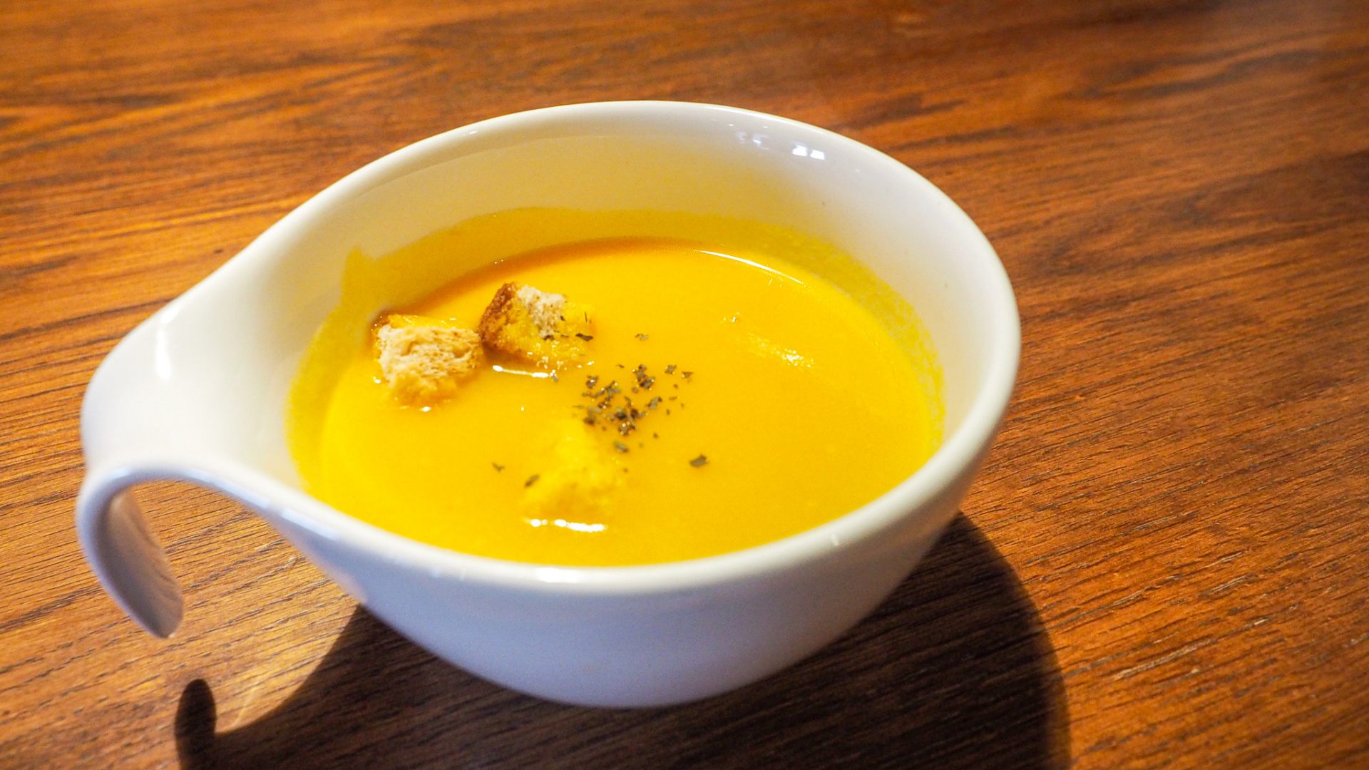 クルトンの大きさ、かぼちゃの甘さが印象的なスープです。