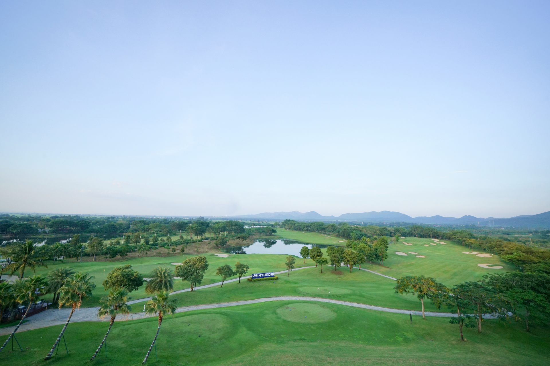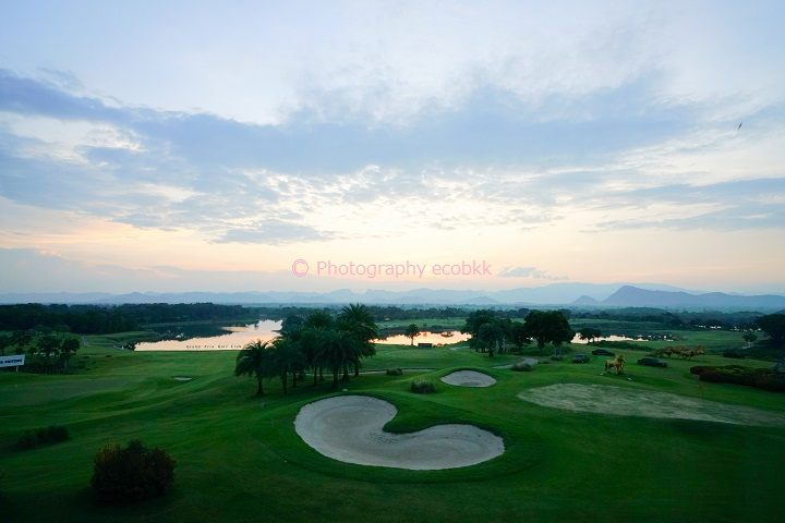 少し高台にあるゴルフ場入口へ到着すると、特別な建物があるわけではありませんが、大変美しい風景が広がっており、自然環境を楽しむ旅行に来たかのような気分に包まれました。午後スタートのラウンド終了後、レストランエリアから見える夕焼けの美しさに再度感動しました。ピンクがかった夕焼けの空と池に、バンカーがハートの形に見えるのも幻想的でした。