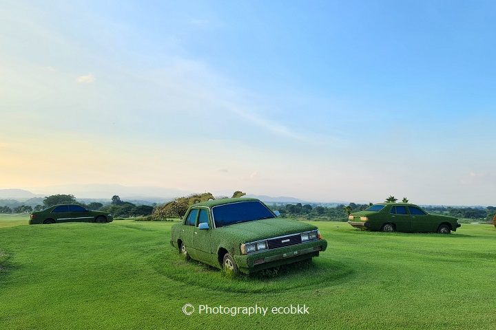 また、オーナーのPrachin Eamlumnow博士さんは、モーターショーを先駆者でもあり、敷地内にユニークな車のオブジェがあり、2番ホールから3番ホールの移動中にも垣間見ることができます。ラウンド終了後、カートに乗ったまま、キャディーさんが案内してくれましたが、クラブハウスからもわりと近いところにあります。