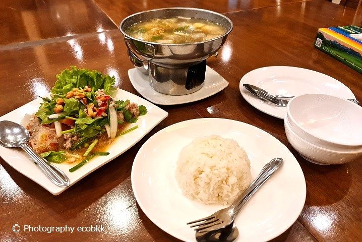 今回は、辛くない豆腐と豚ひき肉のスープ「ゲーンチュート・タオフームーサップ」(中央奥)を頼みました。