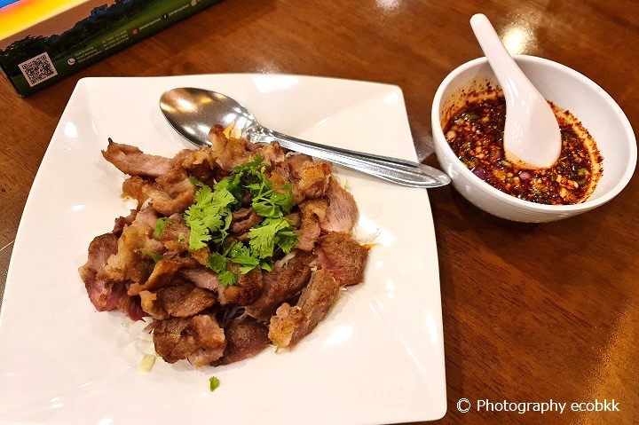 私が不在時に、夫が頼んだという豚のど肉の炭火焼「コームーヤーン」という料理のようですが、もしかしたら、コーという単語の発音が正しくなく、普通の豚肉の炭火焼「ムーヤーン」が出てきた可能性がありますが、こちらもなかなかおいしかったです。