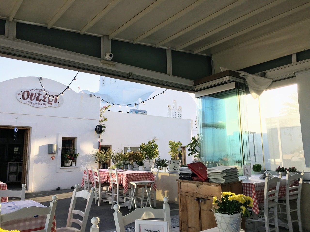 そのおかげで、来るなりすばらしい夕日を見ることができましたが。海を眺めながらのロマンチックな食事は家族連れには懐面でも厳しいので、少し奥まったひっそりとしたレストラン「Ouzeri」に入りました。