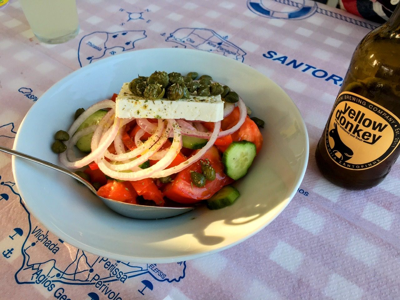 海沿いの店が客であふれ返っているのに対し、空席が目だつ同店にかすかな不安を覚えましたが予想に反しこれが大当たり。肉食ばかりのイギリスから来た身としては常にシーフードに飢えているので、さっそくエビのグリルやタコがたっぷり入ったパスタなどを頼みましたが、国を冠した「ギリシャサラダ(The Greek Salad)€8.5」は記念すべき初日の食事としては最高でした。