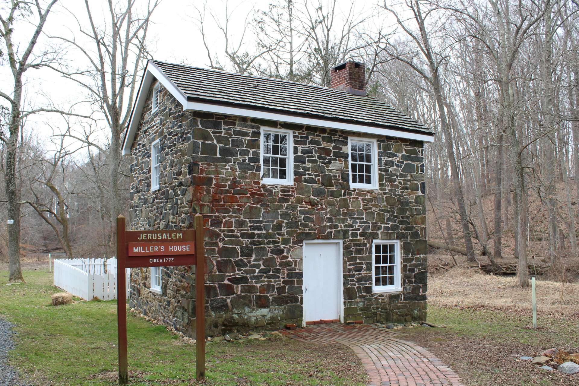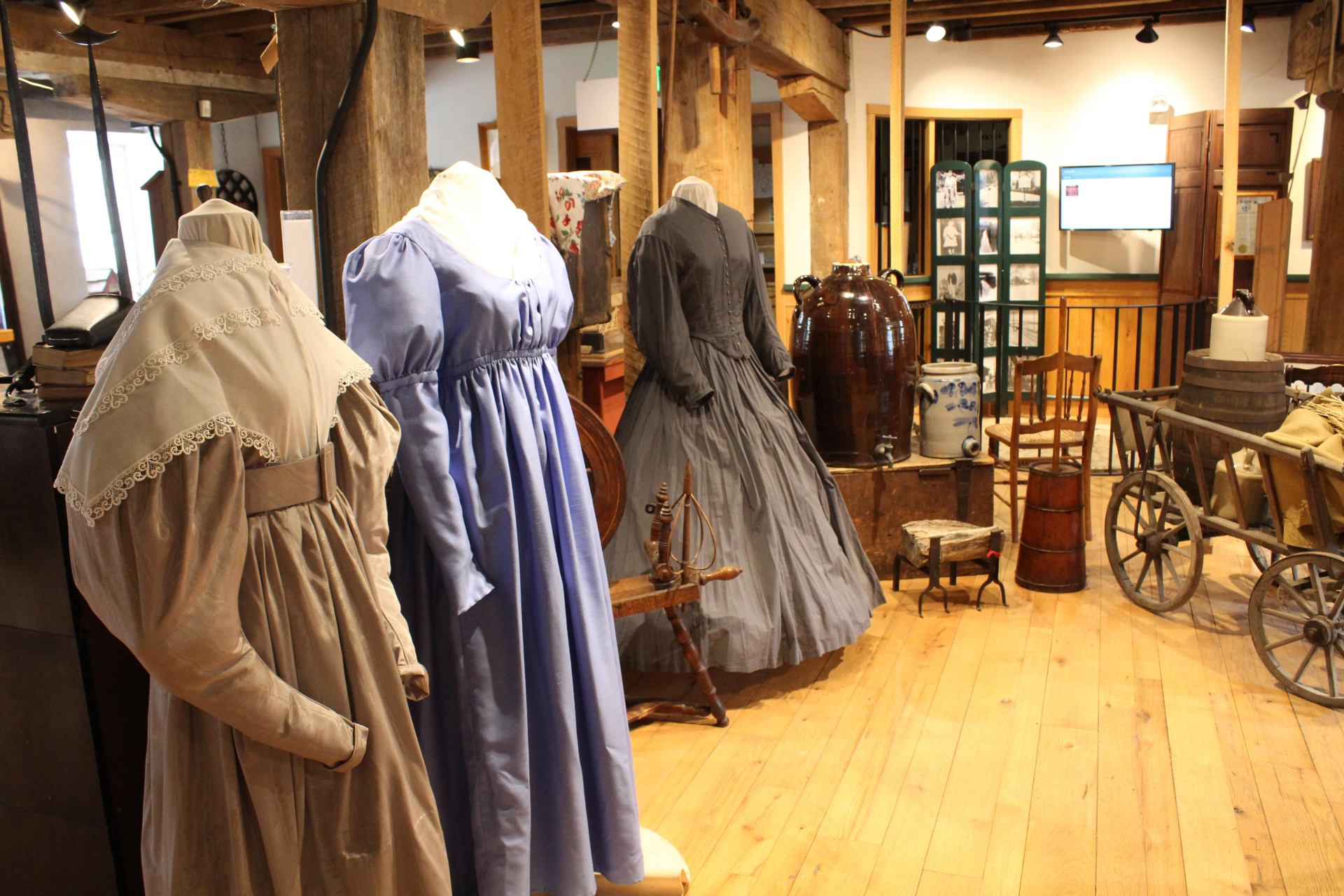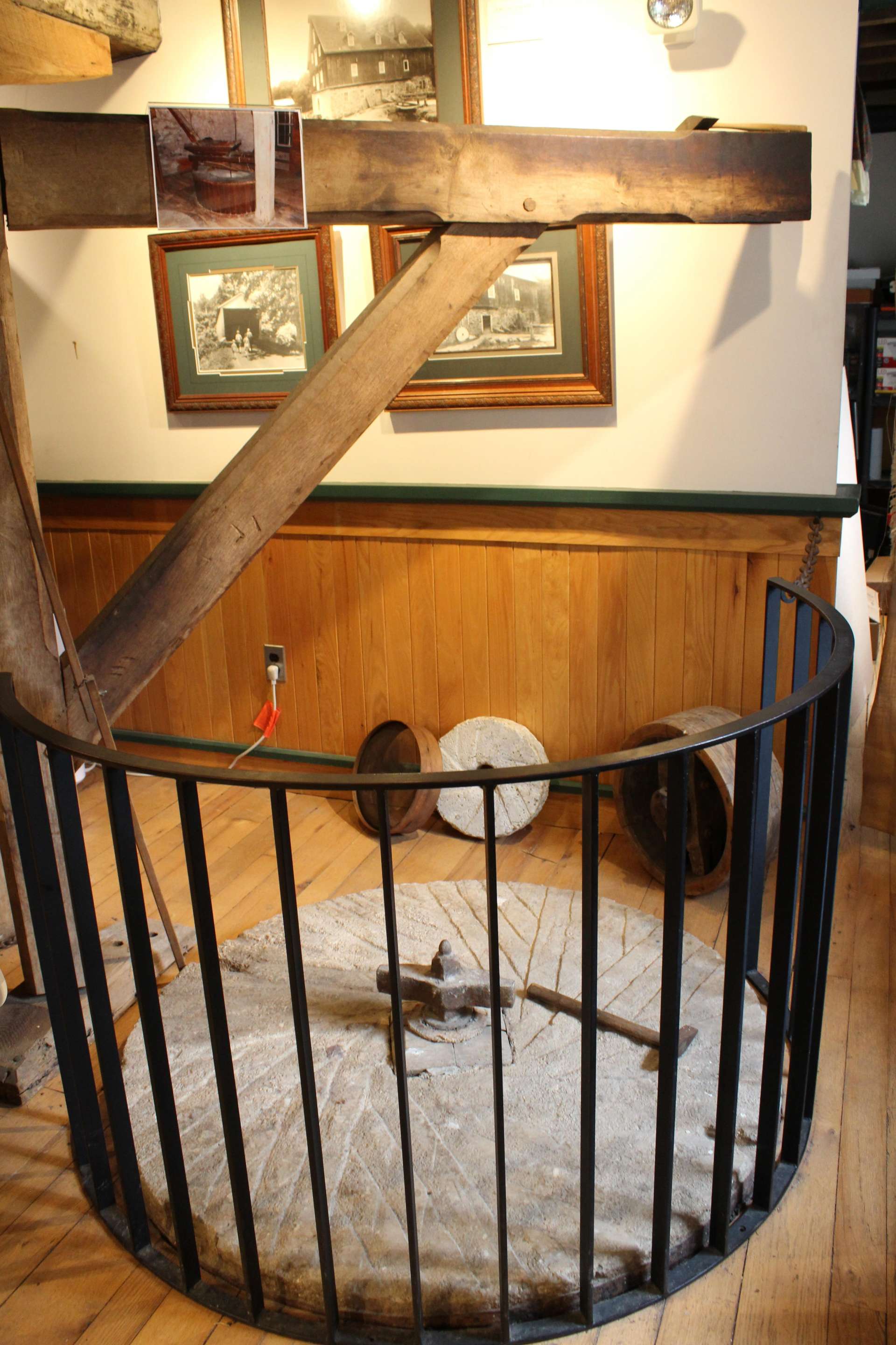 ジェルサレム歴史村に話は戻り、まずは1772年建造の旧商業製粉場の赤い小屋を覗いてみます。ここはガンパウダー・フォールズ州立公園のビジターセンター兼歴史村の博物館として公開されており、地下にはかつて水車の力で石臼を動かし、1961年まで小麦粉の製粉事業をしていた跡や、18~19世紀の生活用品、鉄製品(敷地内の鍛冶場での実演で作られたレプリカもある)などが数多く展示されています。