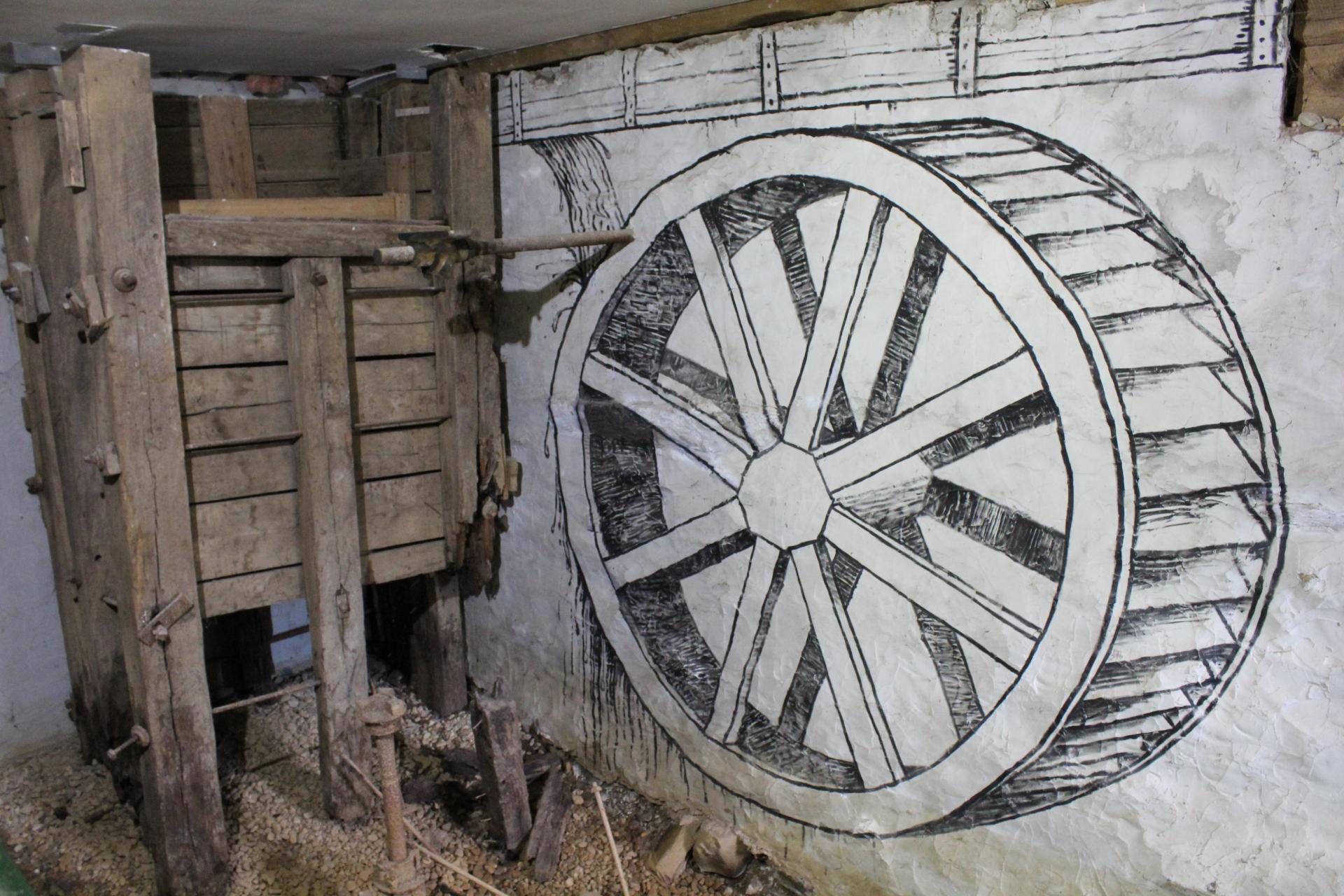 地下の水車自体は現在既に撤去されていますが、壁画のイラストで往時の動線や大きさがわかるようになっています。