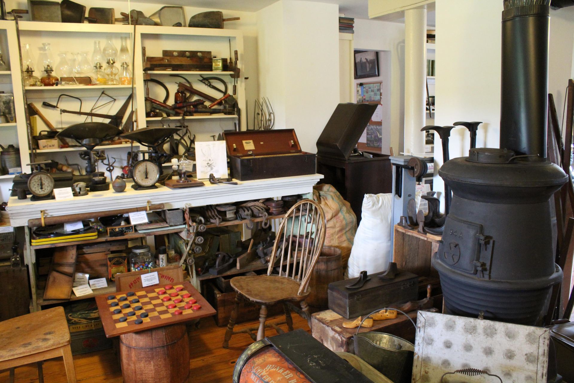 アメリカのジェネラル・ストアとは、かつて町にひとつはあった小さな雑貨店(よろず屋)で、歴史村の一角にも1830年代に建てられ、1939年まで営業していた店の建物も、内部が公開されています。ショーケースをそのまま生かしつつ当時の生活用品が雑多と並べられた店内はそれだけでもタイムスリップした気分になれます。
