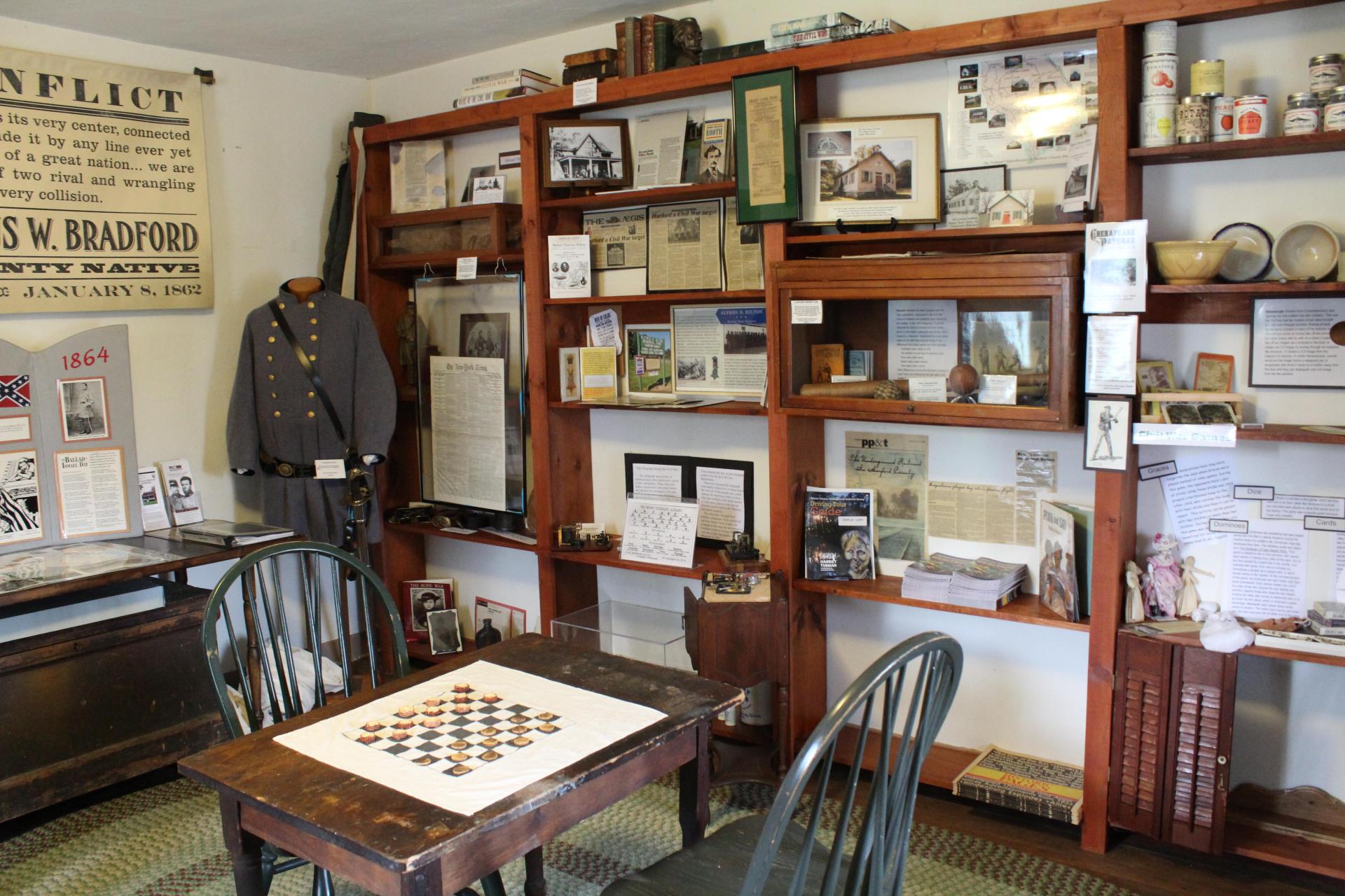 そんな歴史的背景のためか、南北戦争時代の家具や調度品が並んだ一室があり、小さなテーブルの上に兵士たちがつかの間の余暇を楽しむために使った布製のチェスボードと、トウモロコシの芯をスライスした駒が再現されていました。