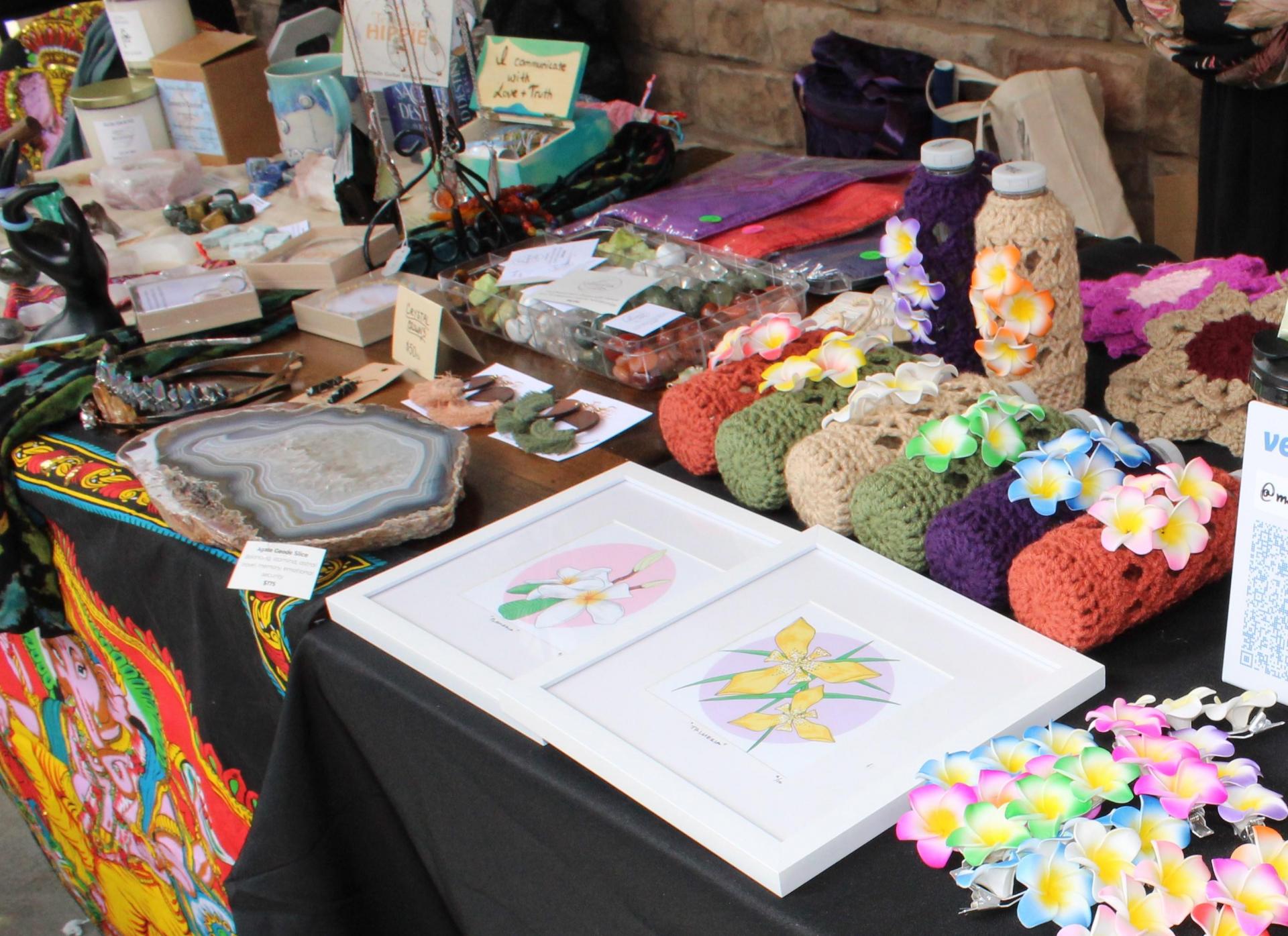 会場ではレストランの中庭の一角にブース用のテーブルを出していただき、一般のお客さんが食事をしている中、ミニステージでのハワイアン・ダンスのショーと共に、アート即売会を行いました。