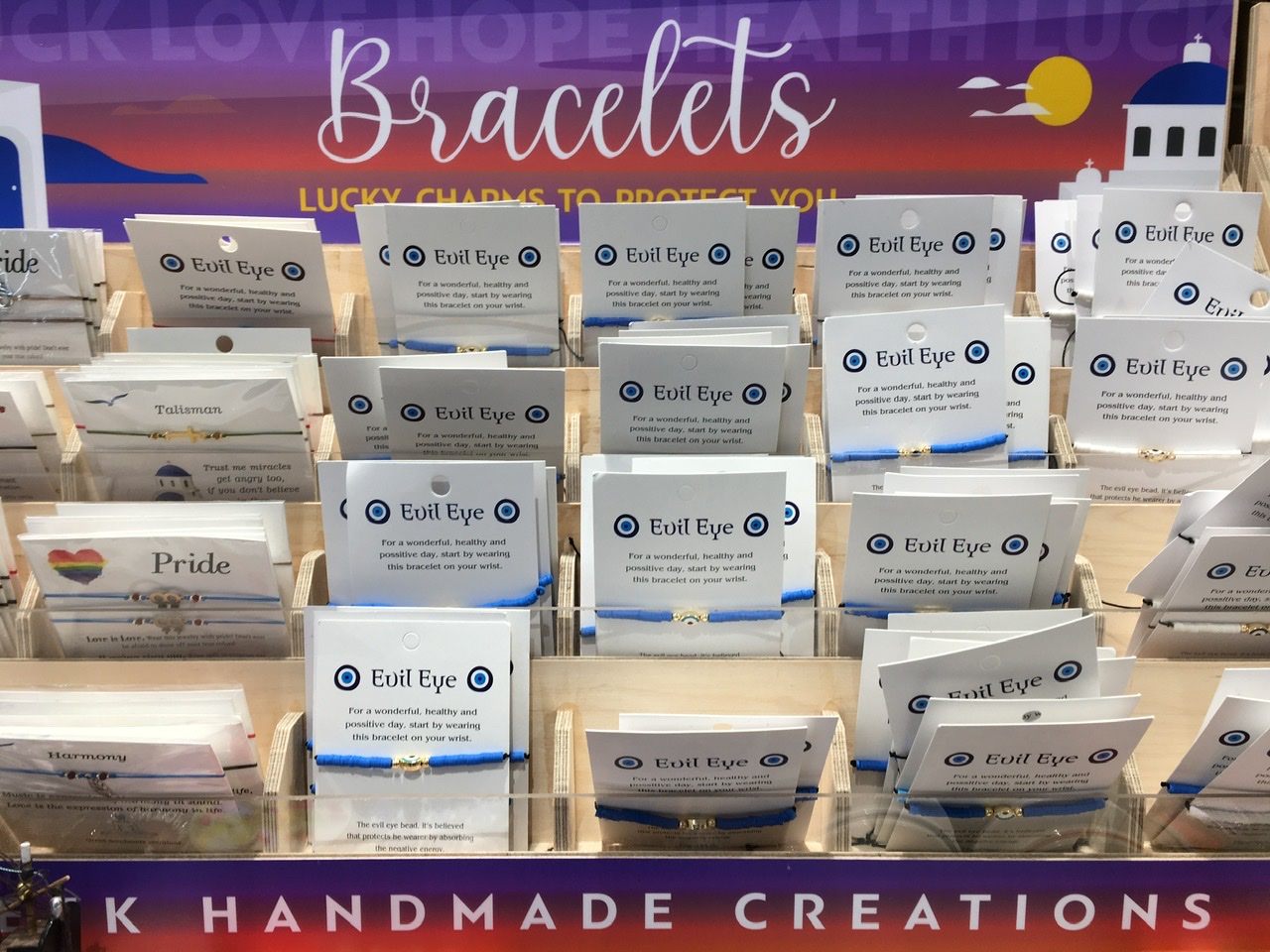 これは「イーヴィル・アイ(Evil Eye)」という魔除けで、ギリシャ語では「マティ」(Mάτι)と言います。「妬みや悪意のこもった視線が災いをもたらす」という古代ギリシャから伝わる「邪視」という信仰で、人によっては「よその子の誕生に対する憧れ」といった単純な感情ですら呪いに繋がる、と畏れられていたそうです。