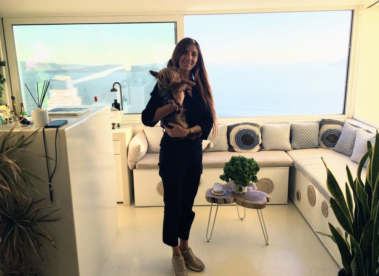 商品はもとより、すてきだと憧れたのは、店内突き当たりのソファコーナー。開け放った正面の窓からは遮るもののない真っ青な海が見え、サイドの窓からはイアの白い町並みが望めます。