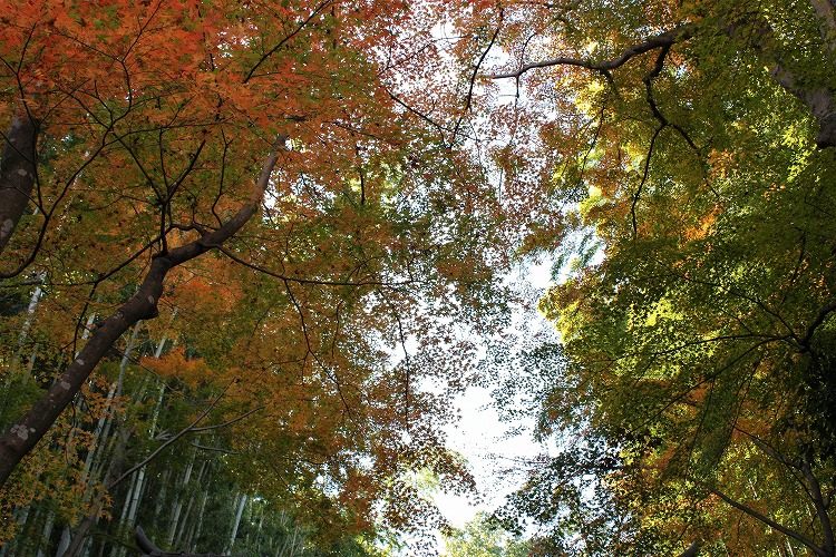 見上げると、空高くのびる竹と紅葉がとてもきれいです。