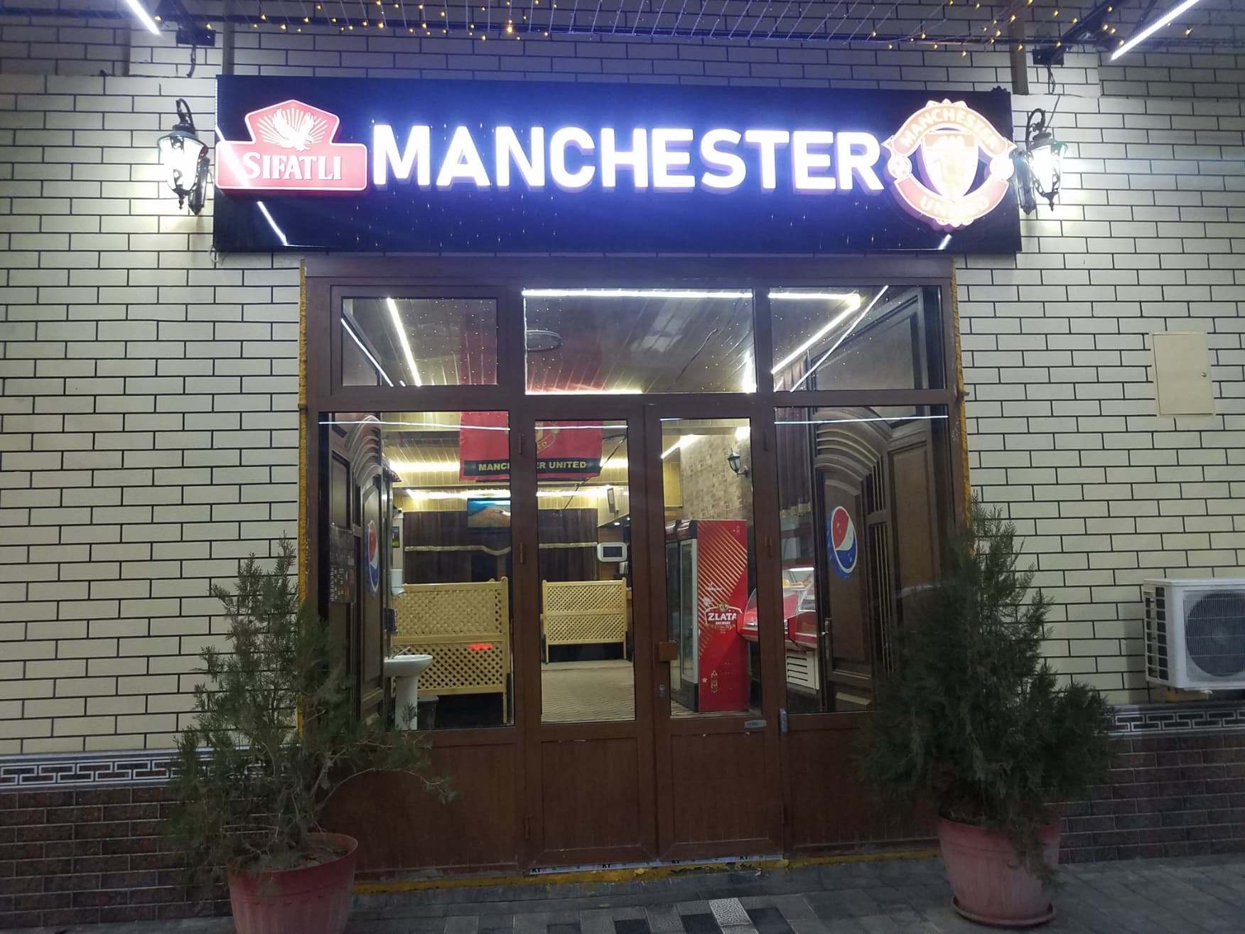 正式な店名も不明ですが、入口にデカデカとMANCHESTERの文字とイングランドの名門マンチェスターユナイテッドのエンブレムが描かれているので、Manchester Shashlikというお店としておきましょう。そう、ここはサッカーの試合を見ながら焼きたてシャシリクが食べられるお店なのです。